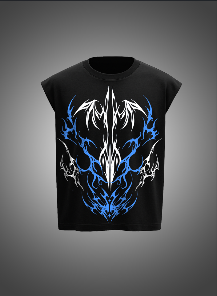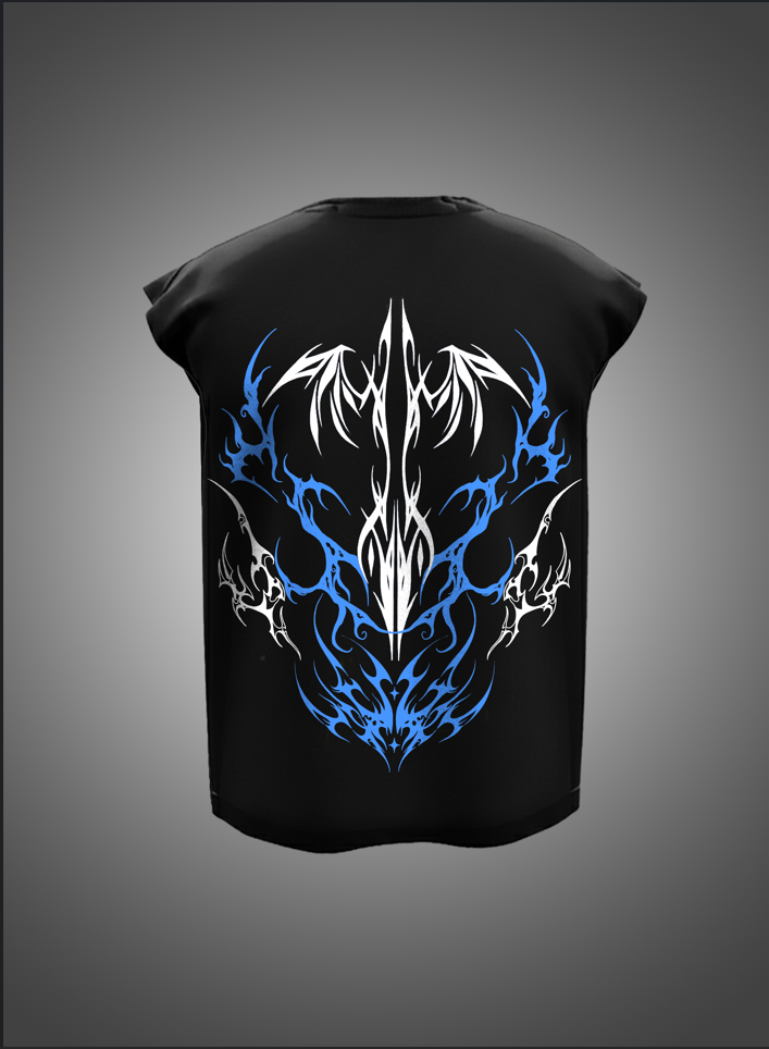 Introducing the Ocean Vest, designed for those who want to make a bold statement in streetwear and gym fashion. This sleeveless black vest features a striking white and electric-blue tribal flame graphic inspired by ocean waves and deep-sea energy. The high-contrast artwork on the back gives the vest a fierce, dynamic look, perfect for workouts, casual styling, or layering. Crafted with soft, breathable fabric, it ensures comfort while maintaining a sharp, edgy aesthetic. Whether you're hitting the gym or the streets, this vest brings power, flow, and attitude in one design.